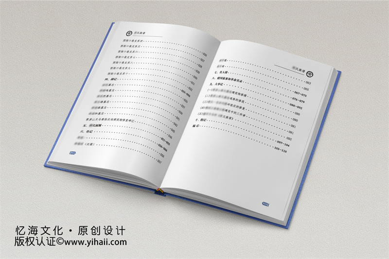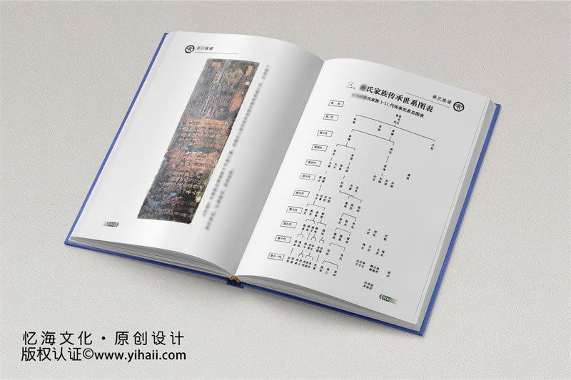 这本家谱就是由忆海文化设计制作完成的,家谱为布艺封面烫金,蓝色与金色的结合让家谱显得更加庄重,本身家谱制作就是一中严肃的事,而简洁的封面设计也家谱更加严肃。内页为铜板纸锁线精装。因为家谱中有较多的图片印刷,采用铜板纸,有更好的色彩呈现。