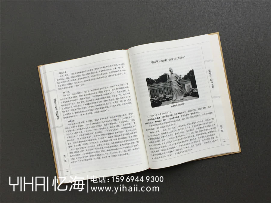 关于装订:采用了彩印+黑白两部分,前面的一部分篇幅因有一些图片素材,则是用200g铜版纸彩色印刷,历数了杨氏从古至今的渊源、姓氏名人、以及现有族人的大家庭合照;后半部分则是大篇幅的文字,及少量的图表,则采用了80g泛黄双胶纸墨印制。全书采用锁线精装的方式,最大程度地保证书册的珍藏寿命。