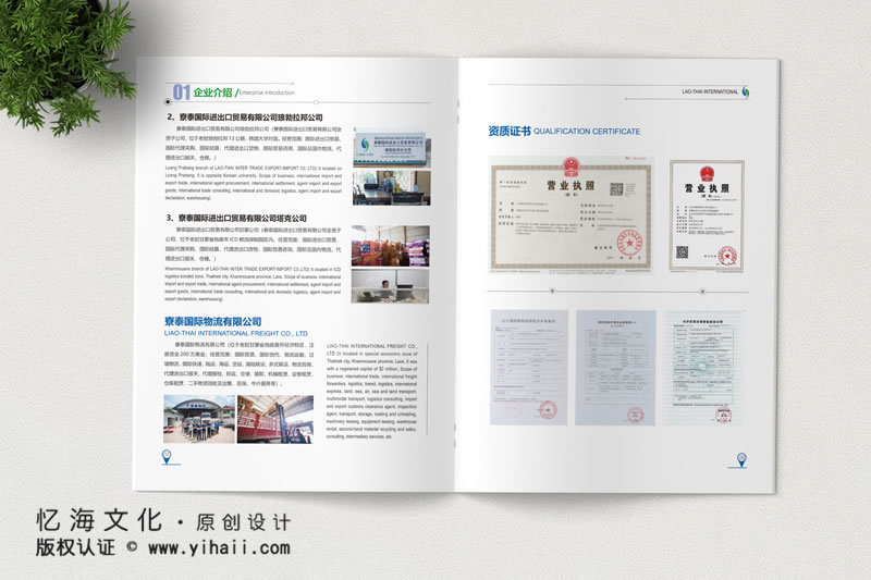这本寮泰国际物流画册是由忆海文化设计和制作完成的,画册采用骑马钉的装订方式,画册共有20个页面,尺寸为A4纸大小。因为涉及到中文和老挝语的应用,排版也是很注重文字内容的结合,既要让中文部分突出,也要让外语便于观看阅读,中文和外语结果布局的位置就显得很重要了。在设计中以中文为主,外语为辅的设计,突出画册的重点内容。