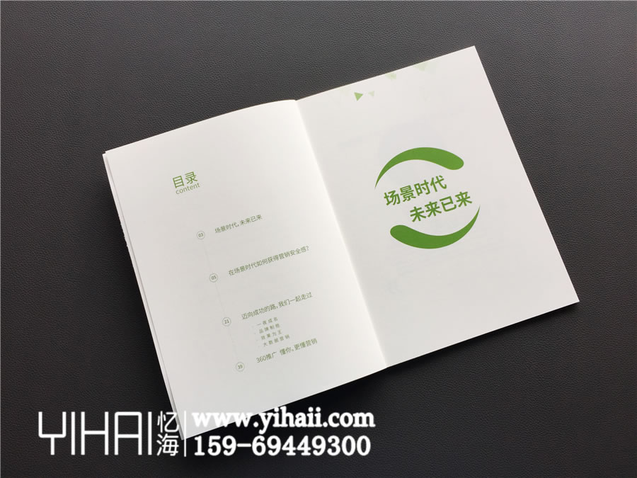 首先针对本案例,忆海小编想先讲述下其装订方式,一般的宣传册多采用铜版纸作为内容载体, 而这本360科技集团公司的宣传册则用的是表面有磨砂质感的特种纸张,特别像书店在售的书籍。画册封面使用了UV工艺,从照片中可能没有很好的体现出来,但是实物质感较为悦目。
